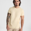 Kurzarm-T-Shirt. Vierlagiger Rundhalsausschnitt aus 1×1-Rippe mit Schulter-zu-Schulter-Nackenband und Seitennähte.